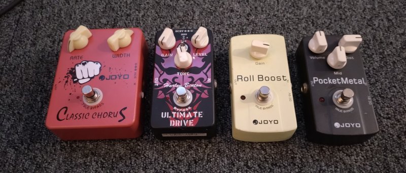 Det er chorus, Boost og rock/ metal pedaler fra Joya og en enkelt fra Harley Benton